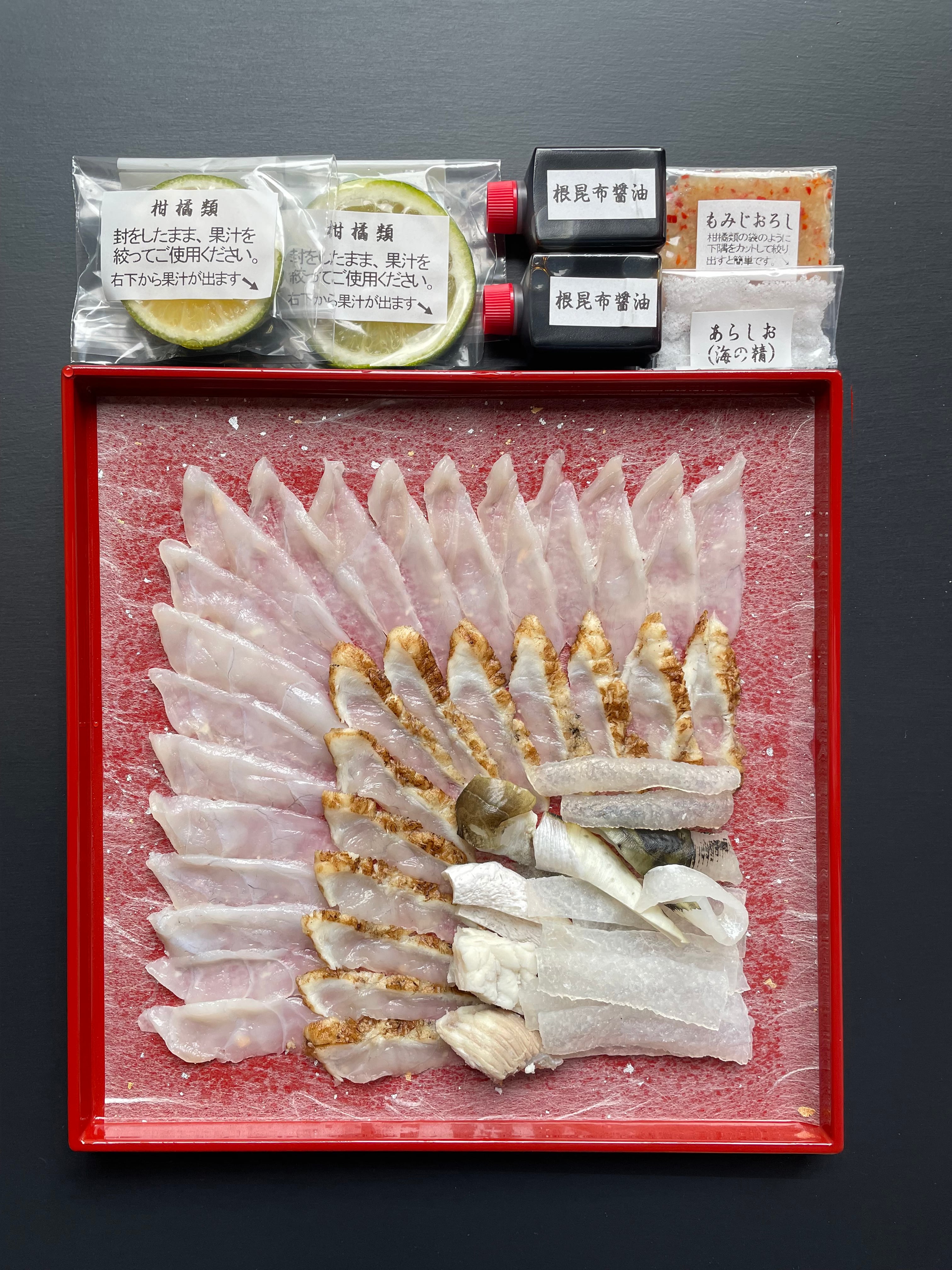 ふぐに付きもののぽん酢はあえてお付けしておりません。昆布醤油に柑橘果汁を入れて、お好みの味にご調整してお召し上がりください。